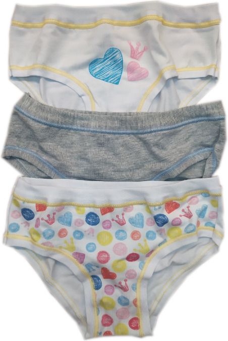 3 ΤΕΜΑΧΙΑ παιδικά κοριτσίστικα εσώρουχα με σχέδια (93%Βαμβάκι-7%Elastane). Δύο λευκά και ένα γκρι μονόχρωμο.