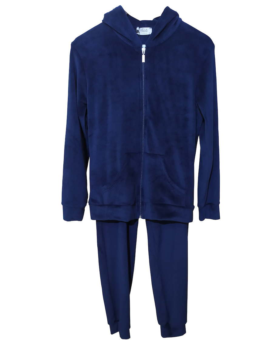 Adelle μπλε βελούδινη φόρμα με κουκούλα.