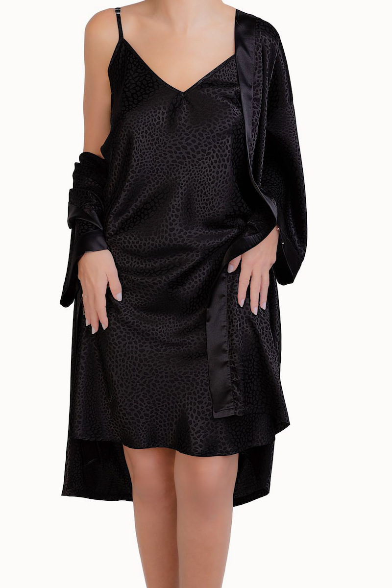 Elite Σατέν Μαύρο Σετ Νυχτικό & Ρόμπα Με Ανάγλυφο Λεοπάρ Σχέδιο.