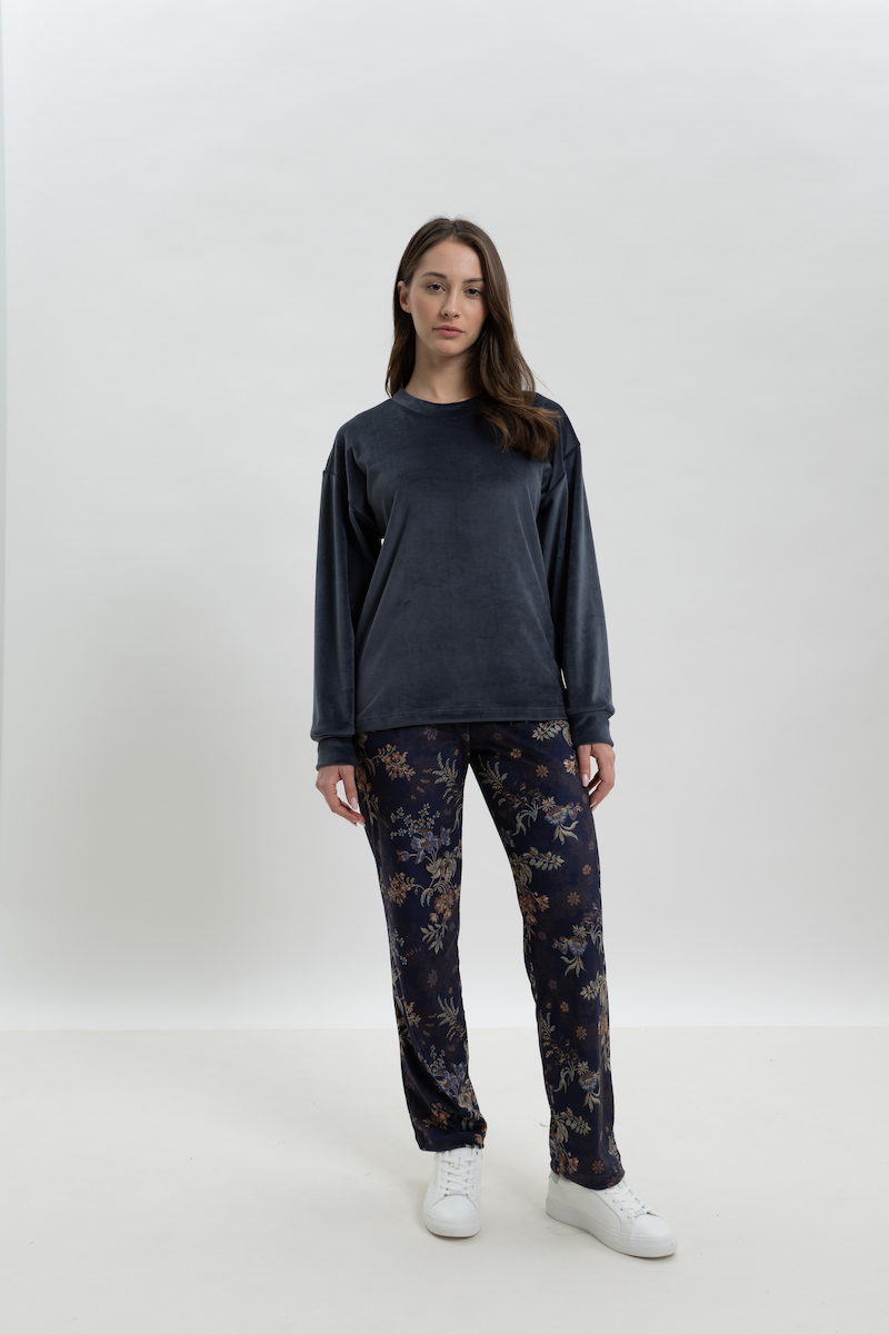 Giota Μπλε Βελούδινη Γυναικεία Πιτζάμα Με Εμπριμέ Παντελόνι.