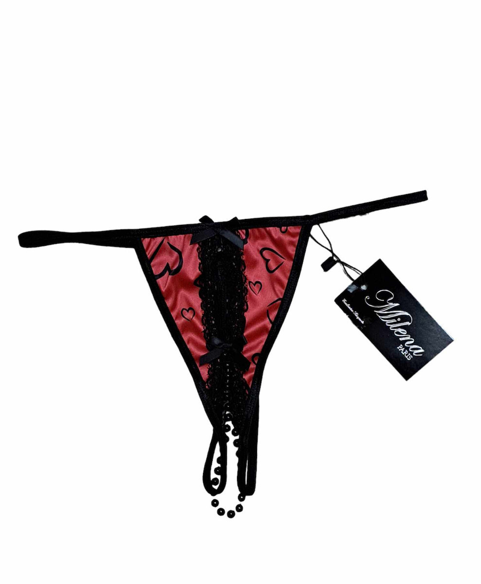 Milena κόκκινο σατέν G-String αυτοκινήτου με μαύρες πέρλες.