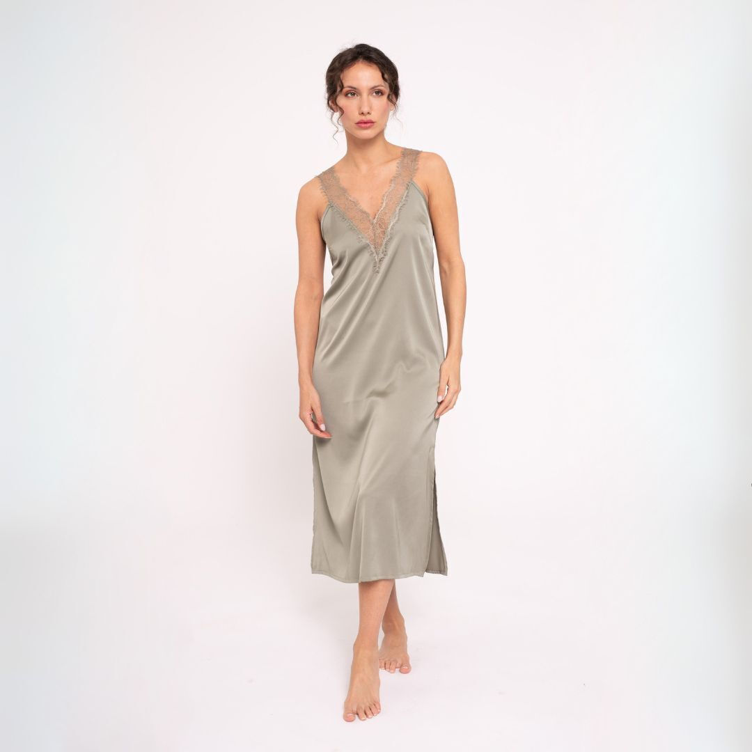 Muydemi Σατέν Λαδί Midi Νυχτικό Με Δαντέλα.