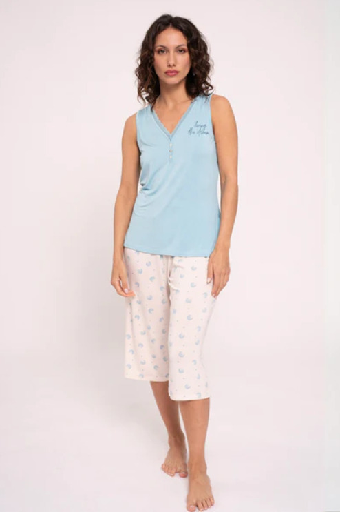 Muydemi Viscose Αμάνική Γαλάζια/Εκρού Γυναικεία Πιτζάμα Με Εμπριμέ Κάπρι.