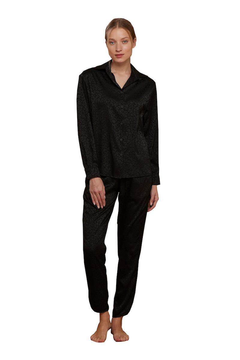 Noidinotte μαύρη σατέν γυναικεία κουμπωτή πιτζάμα με ανάγλυφο λεοπάρ σχέδιο.