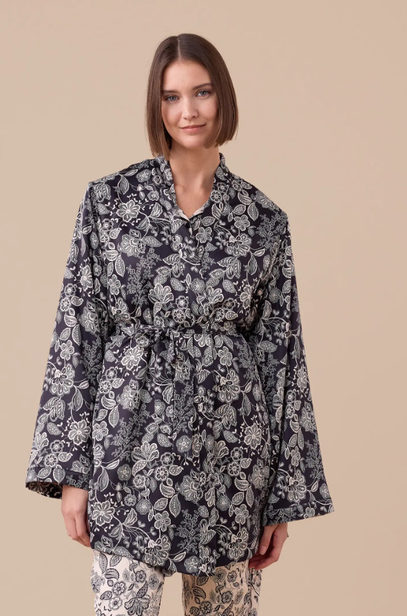 Noidinotte Σταυρωτή Σατέν Μαύρη Εμρπιμέ Ρόμπα Με Μπεζ Επένδυση.