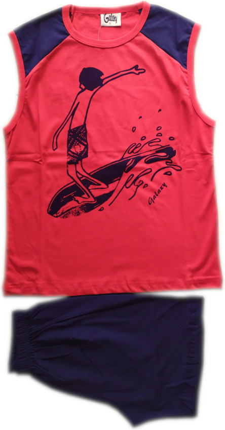 Παιδική αγορίστικη πιτζάμα από 100%βαμβάκι. Κόκκινη αμάνικη μπλούζα με στάμπα. Μπλε μονόχρωμο σορτς.