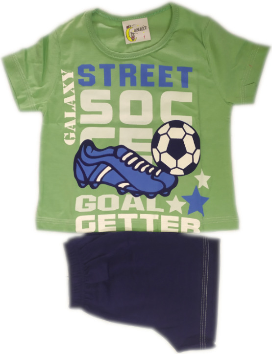 Παιδική αγορίστικη πιτζάμα από 100% βαμβάκι. Πράσινη μπλούζα με κοντό μανίκι και στάμπα. Μπλε σορτς.