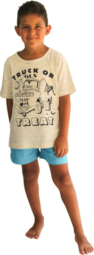 Παιδική αγορίστικη πιτζάμα. Μπεζ μπλούζα με στάμπα. Τιρκουάζ σορτς.
