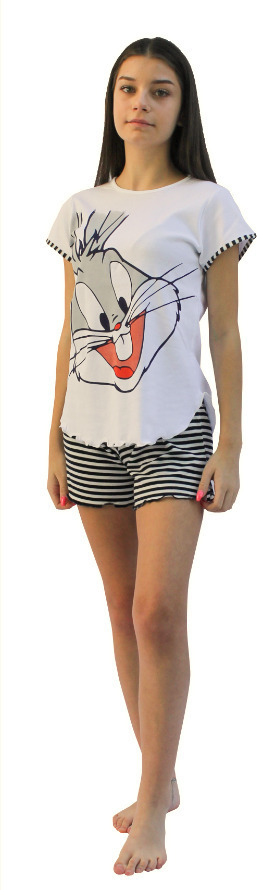 Παιδική κοριτσίστικη πιτζάμα από 100% βαμβάκι. Λευκή μπλούζα με στάμπα. Ριγέ άσπρο/μπλε σορτς.