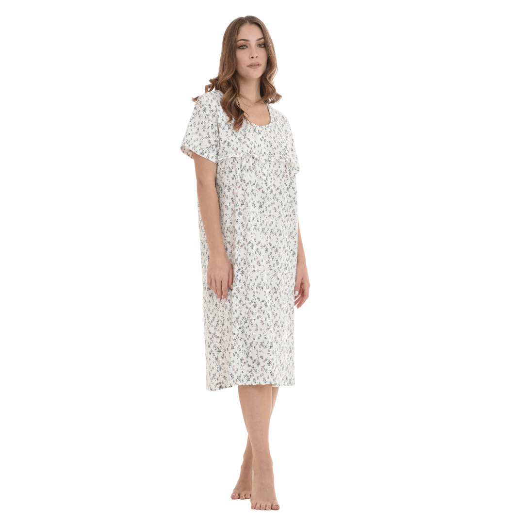 Zen Βαμβακερό Εκρού Φλοράλ Κλασίκο Κοντομάνικο Νυχτικό Με Πατιλέτα.